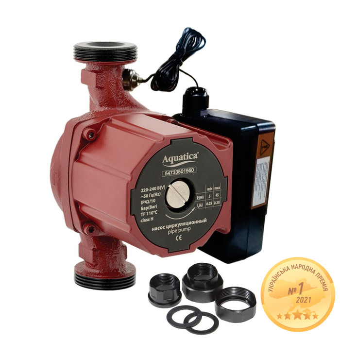 Насос циркуляційний з термодатчиком 65Вт Hmax 4м Qmax 63л/хв Ø1" 130мм+гайки Ø¾" AQUATICA (774011)
