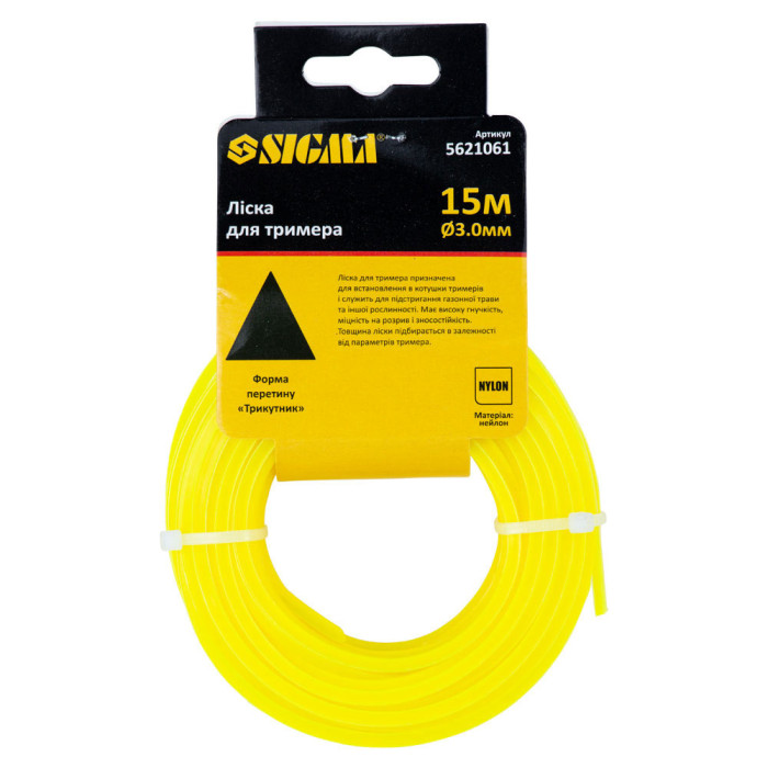 Леска для триммера треугольник Ø3.0мм 15м Sigma (5621061) предназначена для установки в катушки триммеров и служит для стрижки газонной травы и другой растительности. Изготовлена из высококачественного нейлона. По всей длине имеет одинаковую толщину. Обладает высокой гибкостью, крепкостью на разрыв и износоустойчивостью. Не расслаивается и не теряет своих качеств. Толщина лески подбирается под параметры триммера.