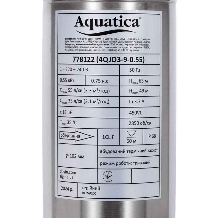 Насос центробежный 0.75кВт H 84(65)м Q 55(35)л/мин Ø102мм mid AQUATICA 4QJD3-12-0.75 (778123)