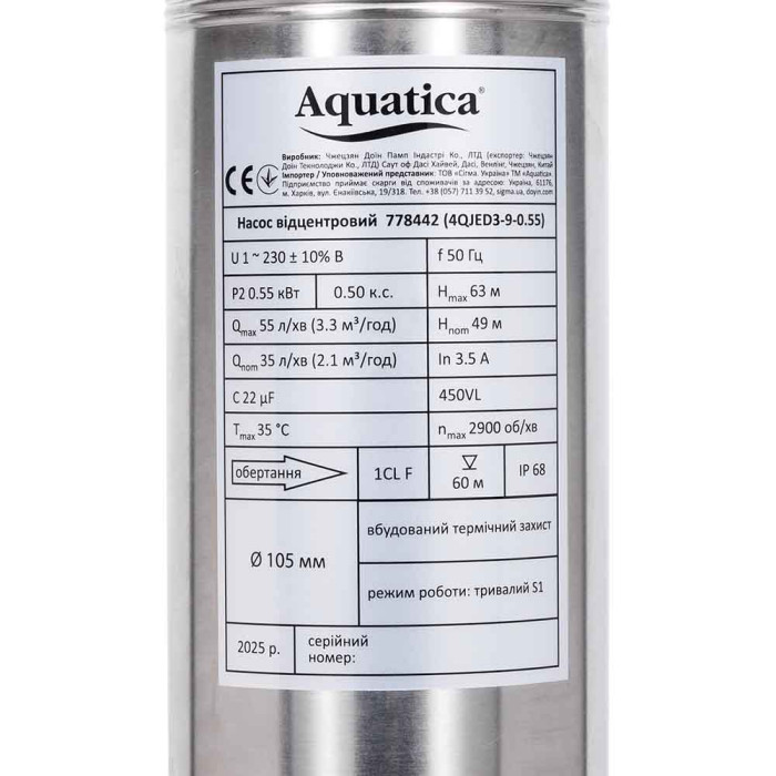 Насос центробежный 1.5кВт H 169(131)м Q 55(35)л/мин Ø102мм 20м кабеля mid AQUATICA 4QJED3-24-1.5 (778447)