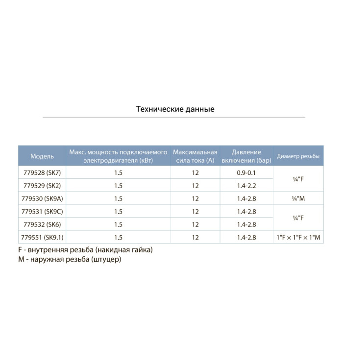 - Размыкаются электрические соединения между электропитанием и оборудованием, когда давление падает ниже установленного значения (давление остановки): 0.9 - 0.1 (бар);