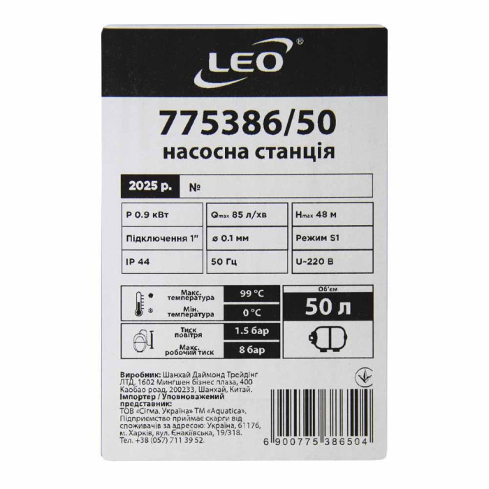 Станция 0.9кВт Hmax 48м Qmax 85л/мин (самовсасывающий насос) 50л Украина LEO (775386/50)